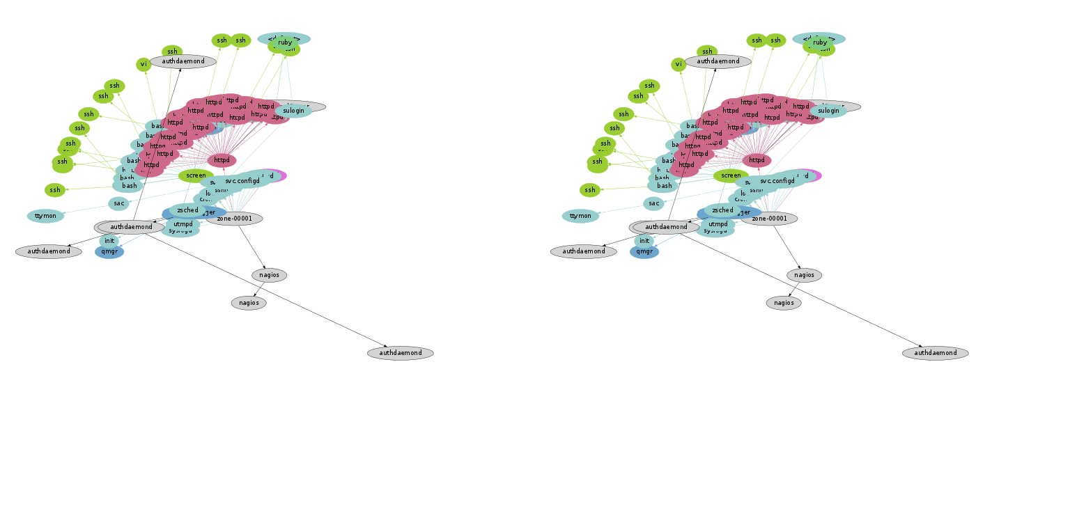 The left animation visualizes a server using process snapshots, similar to what I've done before, but this time by taking a snapshot every second instead of every minute, and displaying it at a normal rate instead of sped up. On the right is the same server during the same time, visualizing the processes using system wide tracing. This is a two second loop (click for larger). Tracing has captured many short-lived processes that were missed by process snapshots.