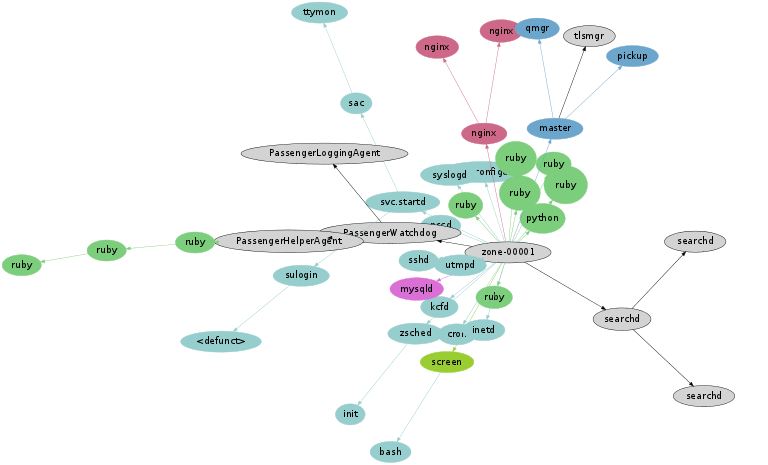The actual data behind these visualizations is still straightforward: process status (ps) plus system-wide tracing (DTrace). Apart from the virtues of DTrace (and graphviz), the only other special technology at play here is OS virtualization, which facilitates capturing process snapshots and trace data across the cloud. The physical server image above was captured using one ps(1) and one dtrace(1M) command, which could see across all thirty active OS instances.