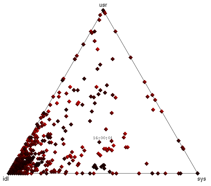 The triangle shape leaves much room unused in the top corners, which may become more noticeable if multiple ternary plots were drawn (instead of the animation). Note that a rectangular x-y plot of %usr and %sys would have a similar degree of unused space for the triangular area where %usr + %sys was greater than 100.